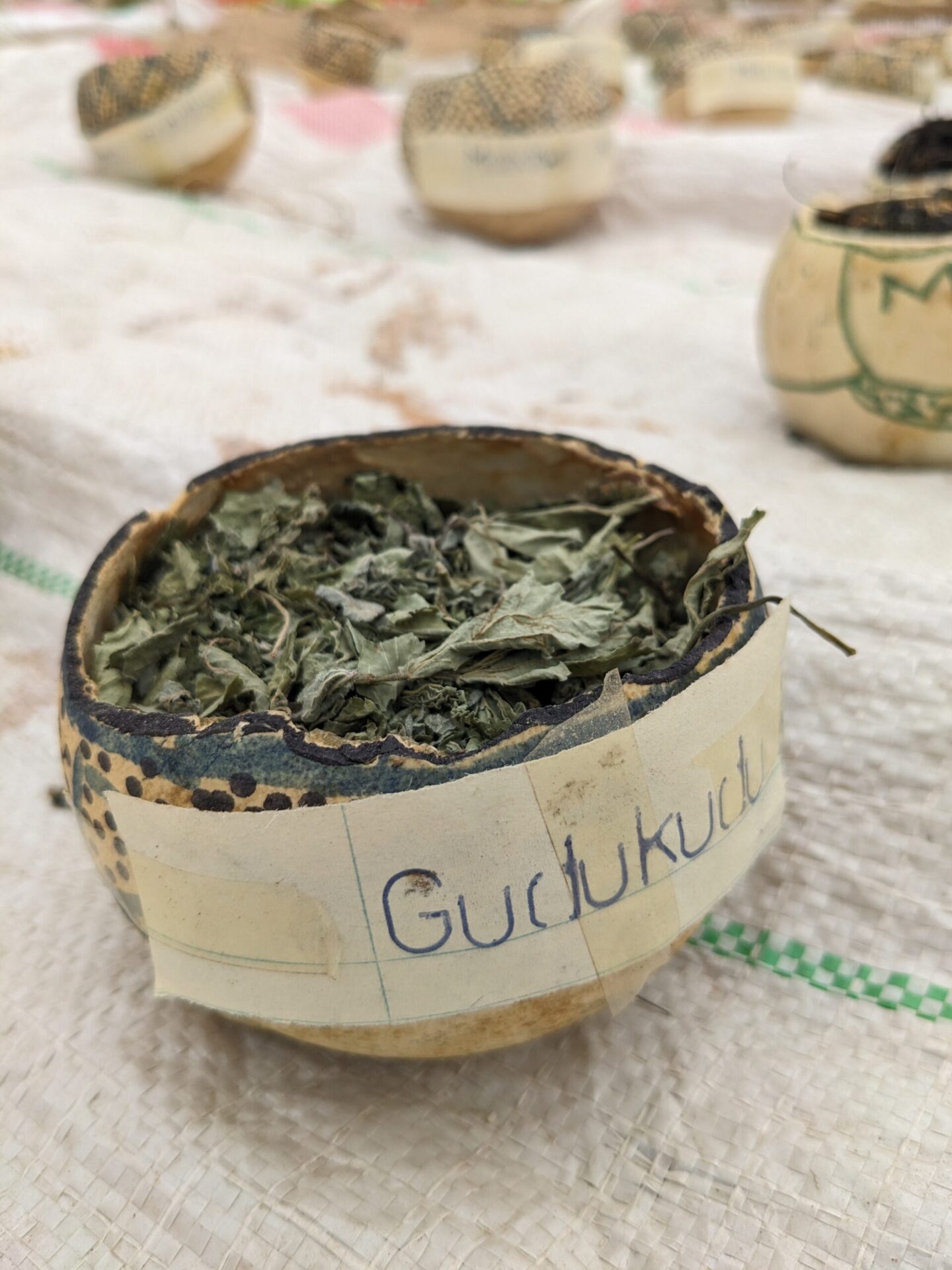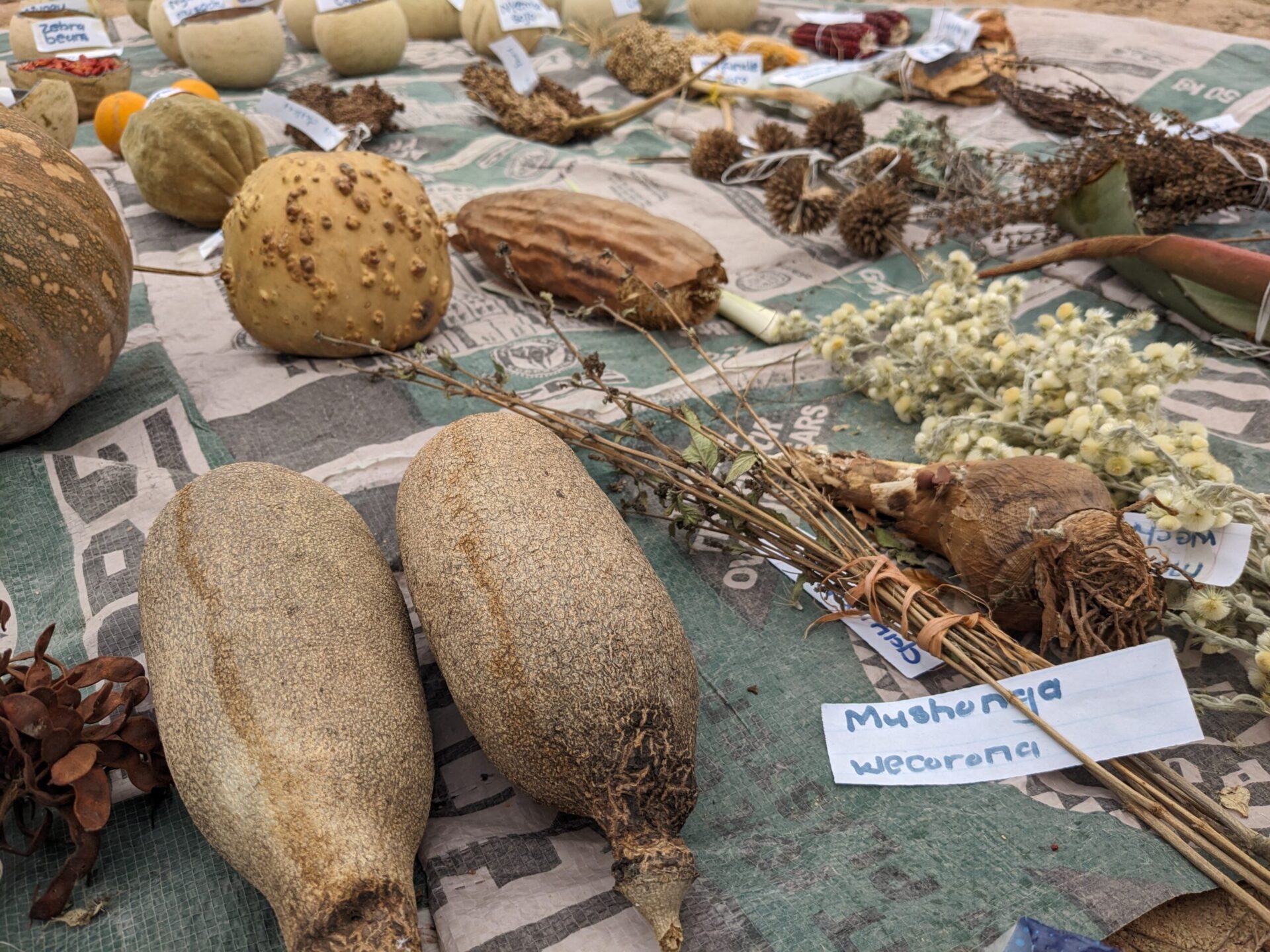 Anxiously watching the grey skies, I slip off to explore the seed displays, worried that rain will get everyone packing and I won’t have a chance to see them in all their glory. I find the judges still hard at work, Agritex officers* with complicated score cards noting the variety and quality of each of the carefully numbered displays. Exhibits are also marked on how they have been displayed, natural baskets and calabashes scoring higher than the colourful but plastic plates. This is a chance for the organisers to take an inventory of what is growing in the area, the diversity in the homesteads as well as in the fields. There are bowls upon bowls of the small grains of various millet and sorghum, pumpkins, gourds, beans, round and ground nuts, and among them the wild foods that are so popular here, magaka (a prickly cucumber), nyeve (also known as blackjack, often regarded as a ‘weed’ but full of nutrition), and countless others, speaking to the importance of protecting wild areas as a source of food.