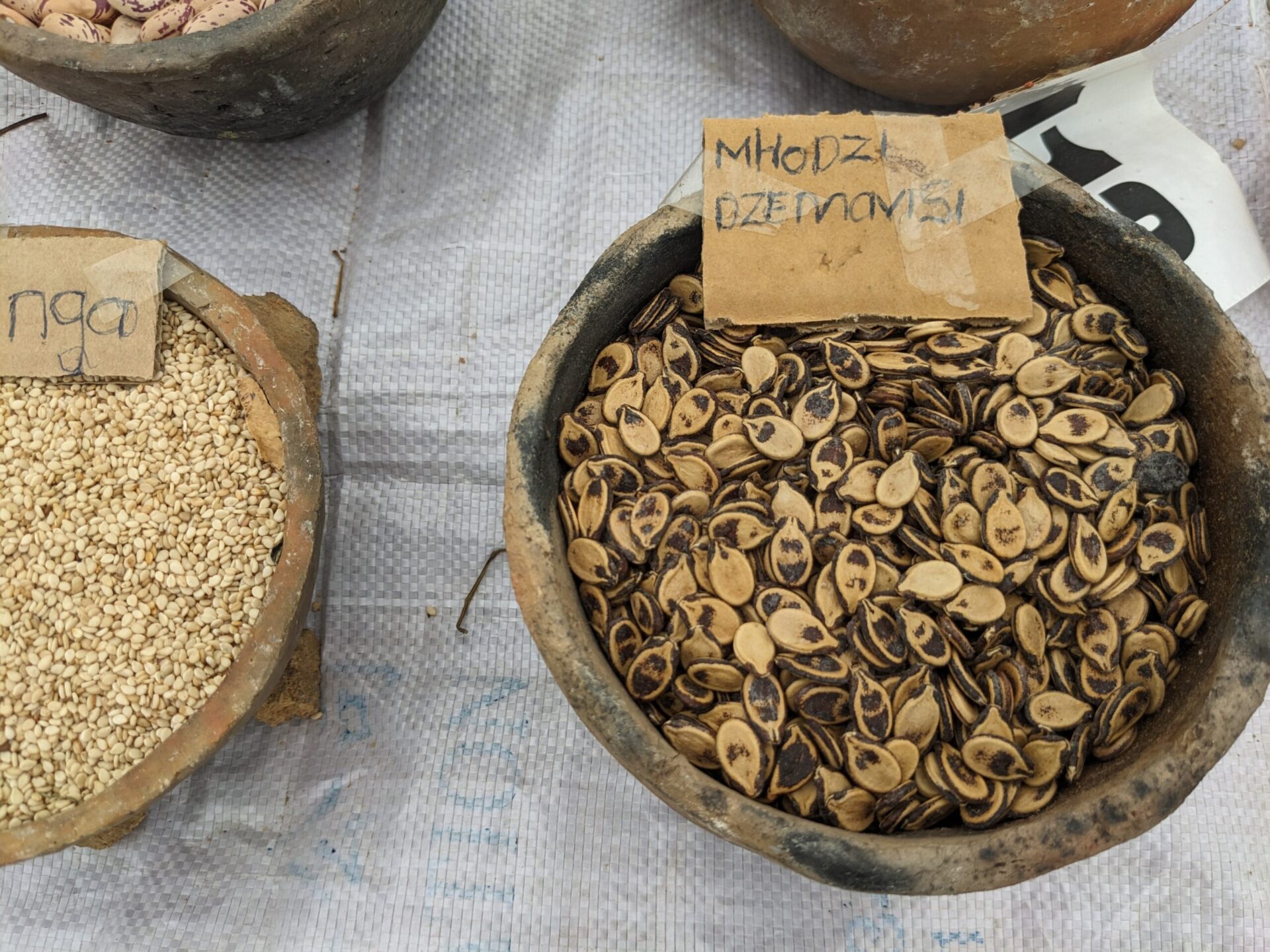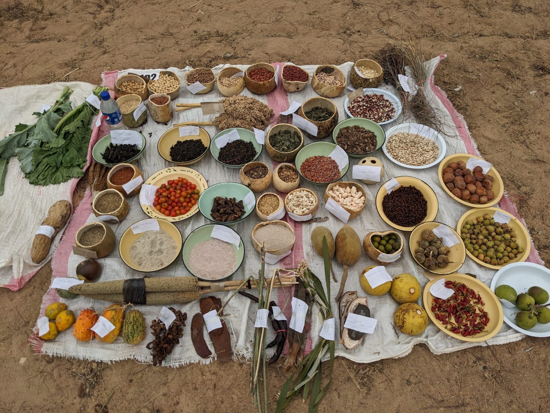 There are bowls upon bowls of the small grains of various millet and sorghum, pumpkins, gourds, beans, round and ground nuts, and among them the wild foods that are so popular here