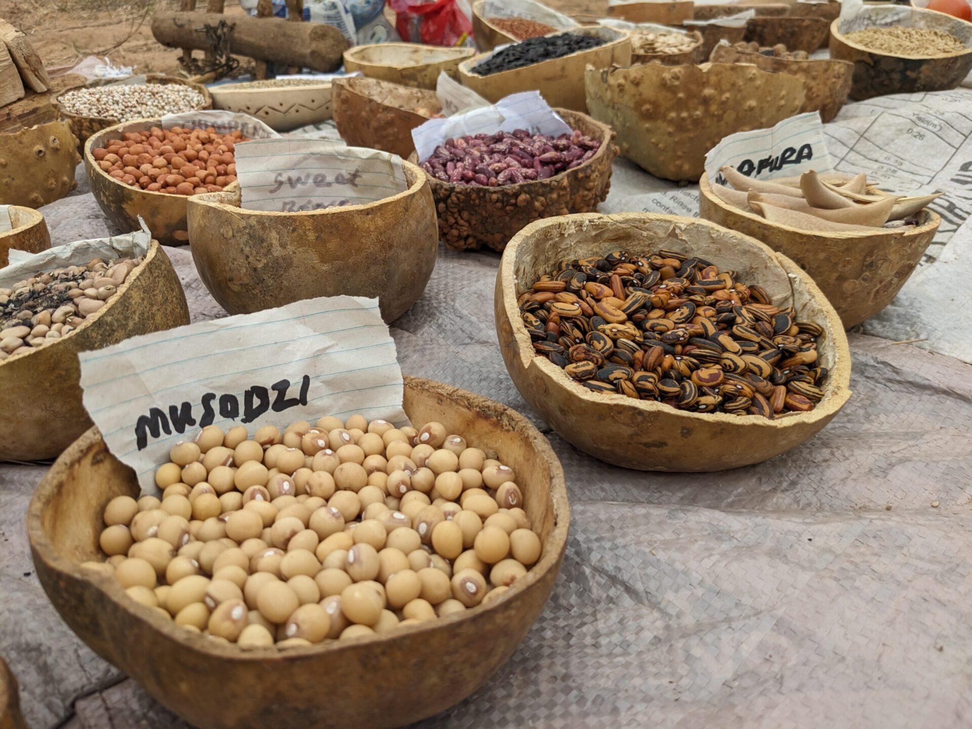 The day of the Seed Fair dawns cool and misty, a surprising change from the heat of yesterday. After a simple, delicious breakfast of millet porridge with peanut butter and honey, our host guides a couple of us who want to walk to the communal garden of Chamas where the Seed Fair is taking place. The others will take the minibus. At Chamas, we are greeted by a bustling event already well under way. Women are singing and dancing, their seed displays laid out in a cordoned off area where the serious business of judging is going on. We are served a cup of tea and a plate of cow peas, both welcomingly warm.
